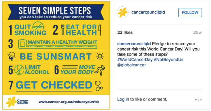 Preventative Measures: CCQ posted the following Instagram photo on February 10, 2015 – “Pledge to reduce your cancer risk this World Cancer Day! Will you take some of these steps? #WorldCancerDay #NotBeyondUs”. This campaign is targeting the CCQ’s followers more broadly. This will be predominately 18 – 39 year olds (82%), living in metropolitan areas in Queensland. The ideal action from this promotion is to persuade followers to undertake these simple 7 steps, in an effort to reduce the rate of Cancer diagnosis.