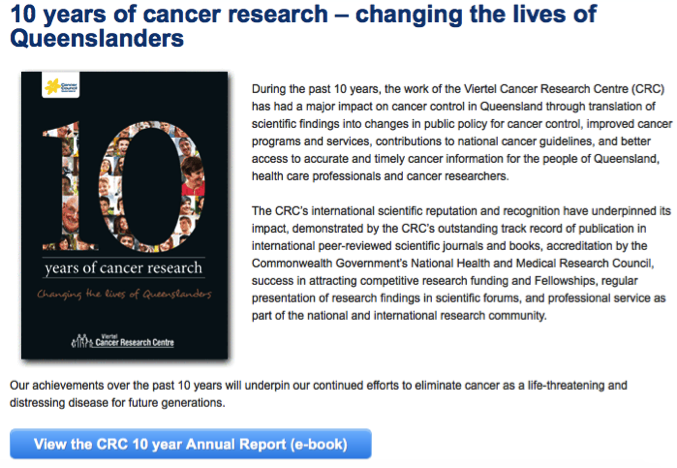 10 Year Annual Report: CCQ collated a report summarising cancer research over the past decade. This sought to inform stakeholders of their contribution towards the progression in cancer awareness, prevention and treatment. This is likely to be targeting older consumers (30 – 60 years old), who may work in the medical industry or have a vested interest in cancer research. The ideal action from this report is that readers to pass this information onto other stakeholders, and to build interest in the field to encourage further research and funding.