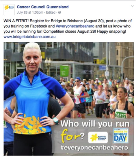 Bridge to Brisbane: CCQ posted the following Facebook message on July 28, 2015 – “WIN A FITBIT! Register for Bridge to Brisbane, post a photo of you training on Facebook and #everyonecanbeahero and let us know who you will be running for! Competition closes August 28! Happy snapping! www.bridgetobrisbane.com.au.” This campaign is targeting two large consumer segments. Firstly, those interested in health and wellbeing. This will typically be a younger age group (18 – 29 years old). This segment will be motivated by the chance to win a Fitbit Fitness Tracker, as well as the opportunity to participate in a physically challenging activity. Secondly, those who have been affected, either directly or indirectly, by cancer. This will typically be an older age group (30 – 55). This segment will be emotionally or morally motivated by the opportunity to support a cause close to them. The ideal action of this promotion is to attract more registrations for the Bridge to Brisbane, and increased exposure for the event.